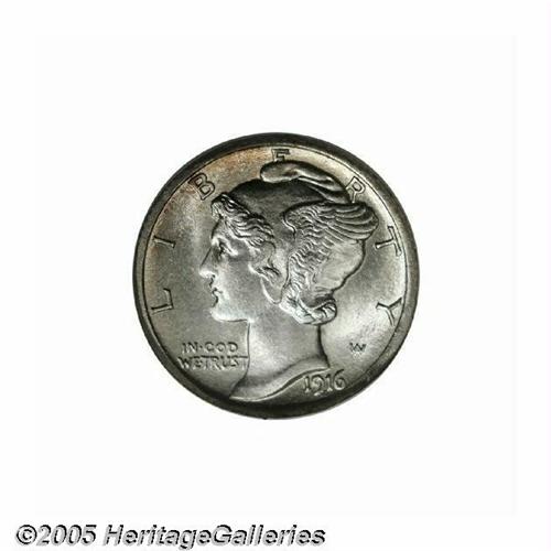 <B>1916-D<10C> MS64 Full Bands NGC.</B></I> Sharply struck and fully lustrous. Almost fully brilliant, with a faint blush of pale gold at the obverse rim. Virtually all design features are defined to full advantage including the cap, feathers, and almost all of Liberty's hair tresses. On the reverse, the fasces, olive branch, and inscriptions are boldly and deeply rendered. A mere 264,000 Mercury dimes were coined at the Denver Mint in 1916, and although the 1916-D is not rare in an absolute sense, it is certain very scarce by 20th-century standards; indeed, no other date and mintmark combination in the Mercury dime series has a mintage smaller than 1,000,000 pieces. Since most collectors didn't bother with mintmarks in early part of the 20th century, comparatively few were set aside at the time of issue, and today the supply of Uncirculated pieces is not capable of accommodating collector demand. The great majority of numismatists have to be satisfied with an example in the Good to XF grade range.