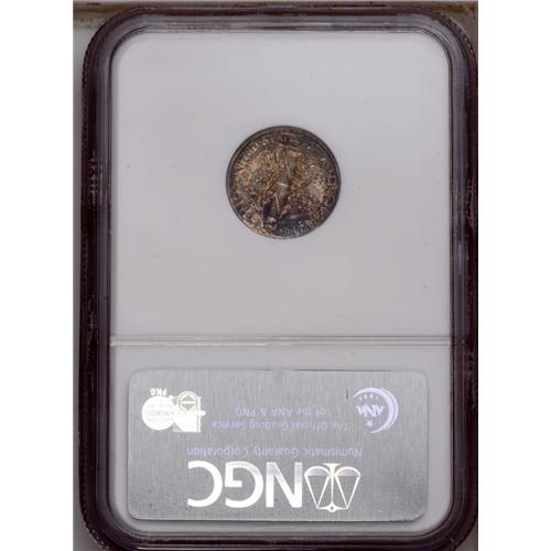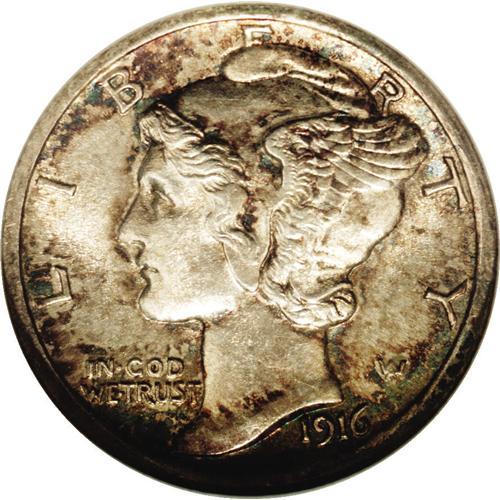 <B>1916-D<10C> MS64 Full Bands NGC.</B></I> The entire mintage of 264,000 Denver Mint dimes was struck in November of 1916. Presses were needed for the new quarter, and before dime coinage could resume a new year had begun. The 1916-D is not an absolute rarity, but the demand in all grades for this issue keeps the supply low. This is an originally toned near-Gem example that has fully split central bands on the reverse. The surfaces are matte-like with a satiny overlay of mint luster. Each side has mottled gray-russet toning with deep blue scattered around the margins.