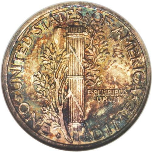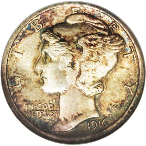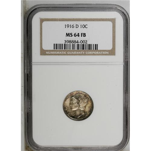 <B>1916-D<10C> MS64 Full Bands NGC.</B></I> The entire mintage of 264,000 Denver Mint dimes was struck in November of 1916. Presses were needed for the new quarter, and before dime coinage could resume a new year had begun. The 1916-D is not an absolute rarity, but the demand in all grades for this issue keeps the supply low. This is an originally toned near-Gem example that has fully split central bands on the reverse. The surfaces are matte-like with a satiny overlay of mint luster. Each side has mottled gray-russet toning with deep blue scattered around the margins. The eye appeal is superior for the designated grade. Struck from moderately rotated dies.