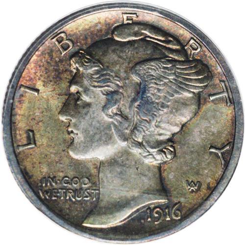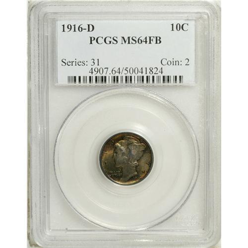 <B>1916-D 10C MS64 Full Bands PCGS.</B></I> The 1916-D Mercury Dime is a key-date issue with a production of just 264,000 coins that were all delivered in November of that year. It seems that the coinage was halted so that Denver Mint personnel could concentrate on production of six million quarter dollars at the end of the year. Nearly all of these dimes that have survived the past century have done so in lower grades, with most examples showing considerable signs of circulation. Choice and Gem Mint State examples are not often seen, especially with full bands like this piece. Both sides have deep and vibrant iridescent toning over satiny luster. A few tiny surface ticks have undoubtedly prevented a higher grade.<BR><I>From The Park Cities Collection.</B></I><BR><BR><b>Shipping:</b> Coin/Currency (<a target="_blank" href="http://www.heritageauctions.com/common/shipping.php">view shipping information</a>)