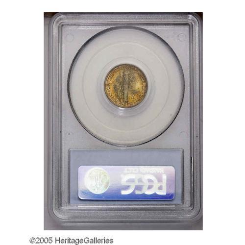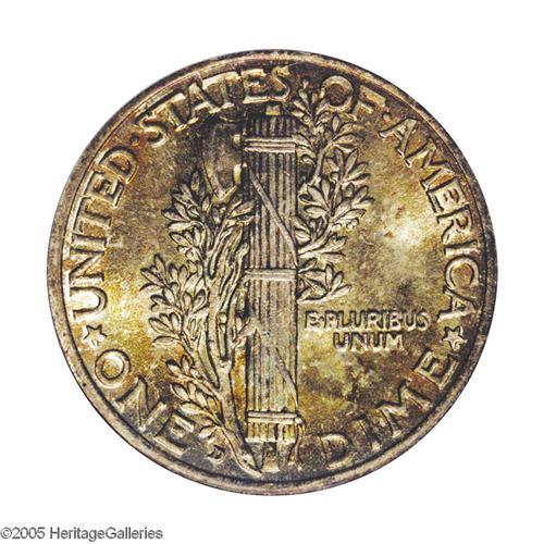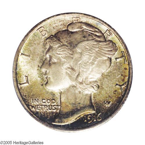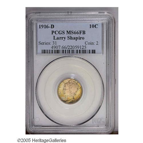 <B>1916-D<10C> MS66 Full Bands PCGS.</B></I> The rarity and desirability of this perennially popular issue are explained by an unlikely confluence of factors, perhaps unfortunately for buyers of premium-quality 1916-D dimes, and fortunately for sellers of those dimes. According to David W. Lange's <I>The Complete Guide to Mercury Dimes (2nd ed.),</B></I> a December 1914 letter from the Executive Committee of the New York Numismatic Club that found its way to Mint and Treasury officials provided the impetus for design changes to our minor silver coinage, the cent having been redesigned in 1909 and the nickel in 1913. By April 1915 it was a foregone conclusion that new designs for the dime, quarter, and half would replace the staid Victorian designs of Mint Engraver Charles Barber. By December 1915 three artists had been contacted to submit trial designs for the new coinage. By February 1916 Adolph A. Weinman had learned that his design submissions for the dime and half dollar would be memorialized in silver. By late August, five pairs of dies bearing the new Mercury dime design had been sent to the Denver Mint. But there, progress halted. Subsequent tweaks of the design (in the relief and other details), the need for approval from AT&T and a vending-machine manufacturer, general confusion, uncertainty, and indirection, and the Denver Mint's focus on quarter dollar production combined to postpone Mercury dime production there. A scant 264,000 pieces of the key 1916-D were coined sometime late in the year.<BR> This Premium Gem, Full Bands example is beautifully toned on both sides in a blend of light bronze and apple-green, with silver-gray highpoints. Brilliant cartwheel luster radiates through the transparent toning. The all-important central horizontal bands binding the fasces are fully split all along their length. The strike is bold, although the lower diagonal band shows slight softness at the highpoint. Careful examination with a loupe reveals a couple of ticks on Liberty's neck, one above the eye, and a final one on her cap, none of them singularly distracting but which perhaps overall limit an even higher grade. Seldom seen finer, and a coin that should excite a number of audiences. Population: 16 in 66, 6 finer (11/05).<BR><I>From The Larry Shapiro #1 All-Time Finest Mercury Dimes Full Bands Basic PCGS Registry Set.</B></I>