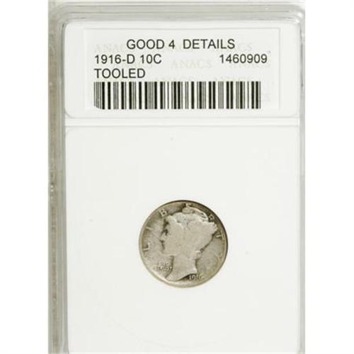 <B>1916-D 10C --Tooled--ANACS. Good 4 Details.</B></I> A heavily circulated, suspiciously luminous silver-blue and green-gold example that shows minimal central detail. Some metal smoothing is noted at the neck and in the nearby fields.<BR><BR><B>Coin Engraver:</B> Adolph A. Weinman<BR><BR><b>Shipping:</b> Coins & Currency (<a target="_blank" href="http://www.heritageauctions.com/common/shipping.php">view shipping information</a>)