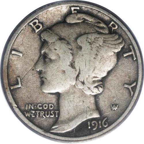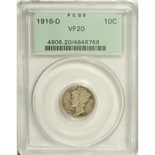 <B>1916-D 10C VF20 PCGS.</B></I> This is a most pleasing example of the key-date to the Mercury dime series. Semi-bright surfaces have a light to medium-gray cast, and exhibit sharp motif detail for the grade; nice delineation shows in the lines on the fasces, and the date, mintmark, and lettering are bold. Some of the typically seen circulation marks are noted, especially on the obverse.<BR><BR><b>Shipping:</b> Coins & Currency (<a target="_blank" href="http://www.heritageauctions.com/common/shipping.php">view shipping information</a>)