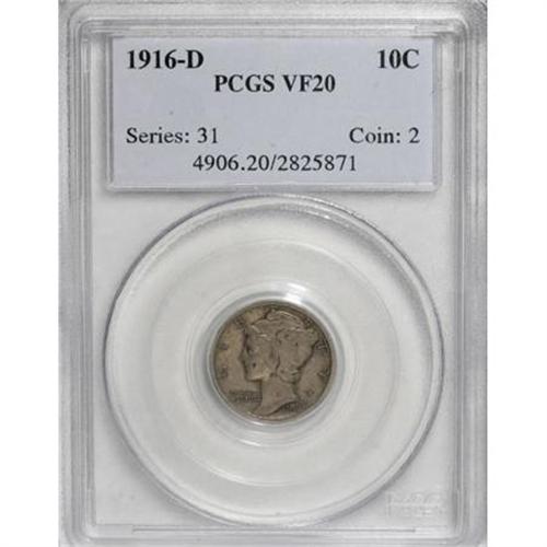 <B>1916-D 10C VF20 PCGS.</B></I> Medium golden-tan toning adheres to both sides of this key-date Mercury dime, each of which displays well defined design elements. A couple of obverse marks are consistent with a coin that has seen moderate circulation. This piece will fit comfortably in a medium-grade collection.<BR><BR><B>Coin Engraver:</B> Adolph A. Weinman<BR><BR><b>Shipping:</b> Coins & Currency (<a target="_blank" href="http://www.heritageauctions.com/common/shipping.php">view shipping information</a>)