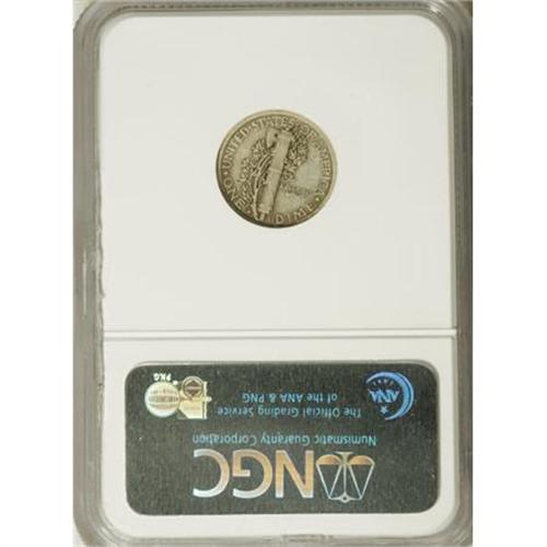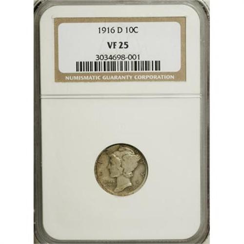 <B>1916-D 10C VF25 NGC.</B></I> The 1916-D key-date Mercury dime is perhaps most elusive in the circulated grades from Very Fine through AU50, as most examples seen tend to cluster at either outside bound of those levels. This charming piece offers a touch of golden patina near the obverse rim, with no singular abrasions and only moderate wear consistent with the grade. <BR><BR><B>Coin Engraver:</B> Adolph A. Weinman<BR><BR><b>Shipping:</b> Coins & Currency (<a target="_blank" href="http://www.heritageauctions.com/common/shipping.php">view shipping information</a>)