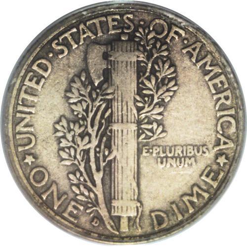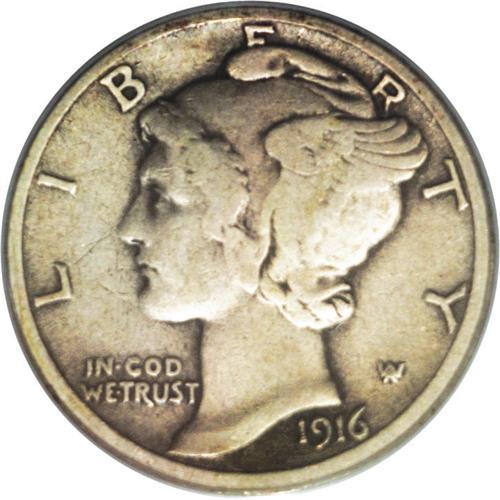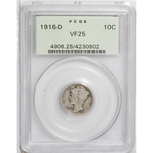 <B>1916-D<10C> VF25 PCGS.</B></I> Like Barber coins from preceding years, the 1916-D generally comes in two conditions: heavily worn and Mint State, with most survivors in AG to VG grades. But here is an unmarked mid-grade example with feather detail on the winged cap. The fasces lines are about 50% complete. An charming dove-gray example of this famous series key. Certified in a green label PCGS holder.<BR><I>From The Tide Collection.</B></I>