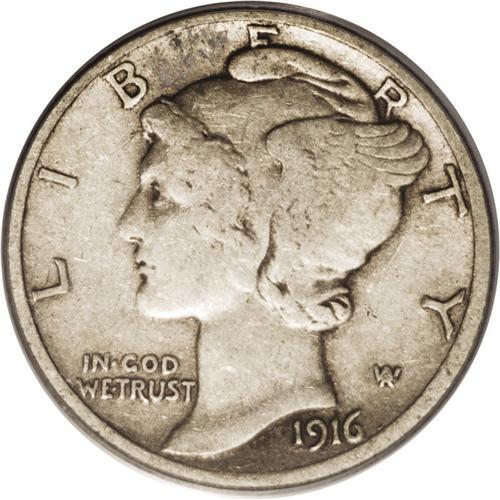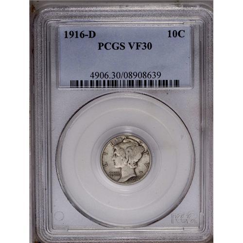 <B>1916-D<10C> VF30 PCGS.</B></I> This popular key date is on the want list of numerous collectors, which keeps the price at healthy levels for grades running from AG to upper Mint State. Nice problem-free, mid-grade examples such as the VF30 presented here appear rather infrequently at auction. Indeed, our records indicate that fewer than 15 coins in this particular grade have appeared in major public sales over the past ten years. Similarly, PCGS has certified only 53 '16-D dimes to date in VF30, some of which are undoubtedly resubmissions.<BR> Pleasing light silver-gray patina rests on semi-bright surfaces that are quite clean. Nice detail is apparent on the design elements, including bold definition on the rims of both sides. A couple of minor grazes are noted in the upper left fields of each side. This piece should elicit spirited bidding.