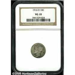<B>1916-D 10C VG10 NGC.</B></I> Medium gray color with splashes of rose and pale blue on the reverse. Relatively problem free for the grade. This issue is usually only encountered in AG grade, or in or near Mint State. Middle grade circulated examples rarely appear on the market.