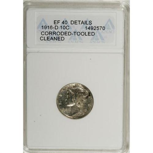 <B>1916-D 10C --Corroded, Tooled, Cleaned--ANACS. XF40 Details.</B></I> A sharp example of this famous key date. Selected areas have dark deposits, which were likely more extensive prior to a harsh cleaning. Granular and abraded, but very scarce above the VG level.<BR><BR><B>Coin Engraver:</B> Adolph A. Weinman<BR><BR><b>Shipping:</b> Coins & Currency (<a target="_blank" href="http://www.heritageauctions.com/common/shipping.php">view shipping information</a>)