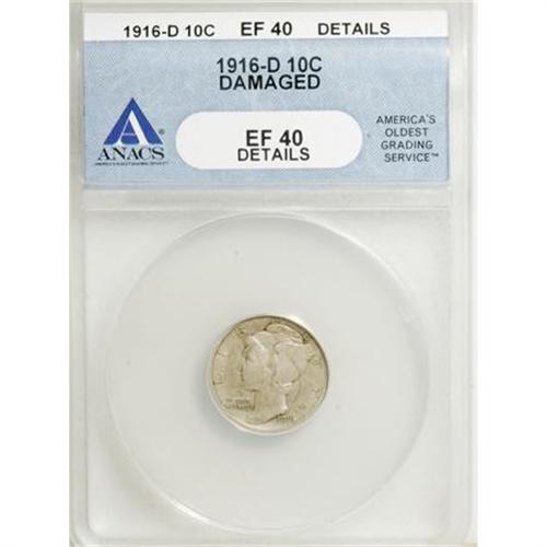 <B>1916-D 10C --Damaged--ANACS. XF40 Details.</B></I> The date and mintmark are bold on this dove-gray key date dime, but a series of moderate to heavy abrasions forms a circular pattern on the reverse, and a couple of light oval-shaped pinscratches enclose the portrait.<BR><BR><B>Coin Engraver:</B> Adolph A. Weinman<BR><BR><b>Shipping:</b> Coins & Currency (<a target="_blank" href="http://www.heritageauctions.com/common/shipping.php">view shipping information</a>)