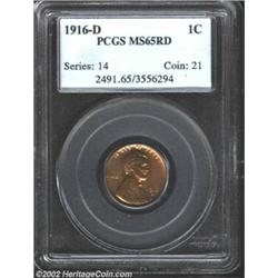 1916-D 1C MS65 Red PCGS. Fiery original color and superior luster, with blushes of orange iridescence along the left obverse margin. The fields are not without a few carbon flecks and pinpoint contact marks, but these are easily offset by this scarce Gem's terrific eye appeal. Population: 37 in 65, 3 finer (10/02). Important notice: We expect to be auctioning lots at the rate of 200-250 per hour. Sometimes eBay Premier live bid software cannot keep up with that pace, so we strongly recommend that you place a realistic proxy bid now as insurance to avoid disappointment. Also please note that all Heritage/CAA lots purchased through eBay Premier carry a 20% Buyer's Premium. Please make sure you read the Terms and Conditions.