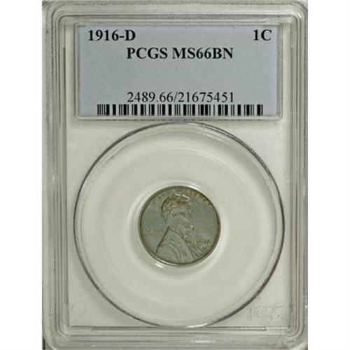 <B>1916-D 1C MS66 Brown PCGS.</B></I> An exquisitely struck 1916-D cent, including complete definition in the hair and beard and lines and grains of the wheat stalks. Beautiful glossy bluish-brown surfaces are devoid of any significant marks. Brown or Red-Brown coins are very scarce, and full Red pieces are rare. Population: 1 in 66 Brown, 0 finer (11/07).<BR><BR><B>Coin Engraver:</B> Victor D. Brenner<BR><BR><b>Shipping:</b> Coins & Currency (<a target="_blank" href="http://www.heritageauctions.com/common/shipping.php">view shipping information</a>)