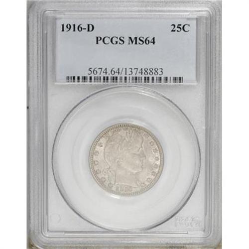 <B>1916-D 25C MS64 PCGS.</B></I> PCGS Population (408/323). NGC Census: (389/215). Mintage: 6,540,800. Numismedia Wsl. Price for NGC/PCGS coin in MS64: $460. (#5674)<BR><BR><B>Coin Engraver:</B> Charles E. Barber<BR><BR><b>Shipping:</b> Coins & Currency (<a target="_blank" href="http://www.heritageauctions.com/common/shipping.php">view shipping information</a>)