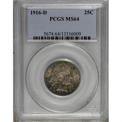 <B>1916-D 25C MS64 PCGS.</B></I> . PCGS Population (412/323). NGC Census: (389/215). Mintage: 6,540,800. Numismedia Wsl. Price for NGC/PCGS coin in MS64: $460. (#5674)<BR><BR><B>Coin Engraver:</B> Charles E. Barber<BR><BR><b>Shipping:</b> Coins & Currency (<a target="_blank" href="http://www.heritageauctions.com/common/shipping.php">view shipping information</a>)