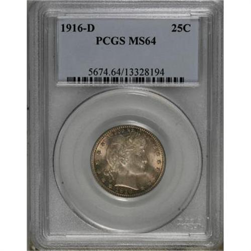 <B>1916-D 25C MS64 PCGS.</B></I> PCGS Population (420/327). NGC Census: (388/214). Mintage: 6,540,800. Numismedia Wsl. Price for NGC/PCGS coin in MS64: $460. (#5674)<BR><BR><B>Coin Engraver:</B> Charles E. Barber<BR><BR><b>Shipping:</b> Coins & Currency (<a target="_blank" href="http://www.heritageauctions.com/common/shipping.php">view shipping information</a>)