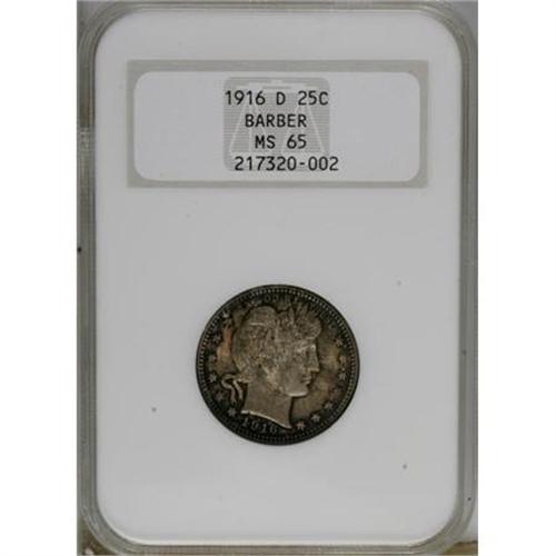 <B>1916-D 25C MS65 NGC.</B></I> Russet and golden-brown embrace much of the fields, while the devices are lightly toned cream-gray. A crisp strike save for the right (facing) claw. In a prior generation holder.<BR><BR><B>Coin Engraver:</B> Charles E. Barber<BR><BR><b>Shipping:</b> Coins & Currency (<a target="_blank" href="http://www.heritageauctions.com/common/shipping.php">view shipping information</a>)