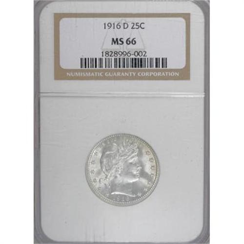 <B>1916-D 25C MS66 NGC.</B></I> Whispers of vibrant frost grace the obverse devices of this final-year Barber quarter, and both sides offer lovely luster. Beautifully preserved and elegant, with just nine finer coins graded by NGC (1/08).<BR><BR><B>Coin Engraver:</B> Charles E. Barber<BR><BR><b>Shipping:</b> Coins & Currency (<a target="_blank" href="http://www.heritageauctions.com/common/shipping.php">view shipping information</a>)