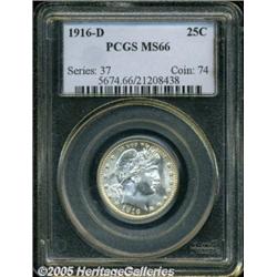 <B>1916-D 25C MS66 PCGS.</B></I> Crisply struck except for a couple of the obverse stars, this bright, frosty premium Gem displays sparkling surfaces that are pristine on the reverse, and only have a couple of tiny milling marks on the obverse, that are placed on the back of Liberty's cap, where they draw very little eye attention. A beautiful, virtually untoned piece. Population: 74 in 66, 5 finer (2/05).
