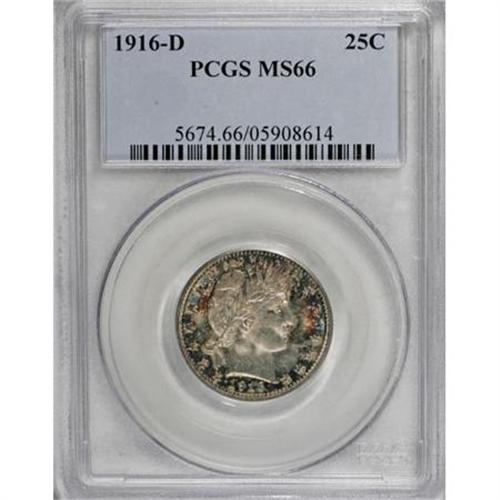 <B>1916-D 25C MS66 PCGS.</B></I> With the Standing Liberty design delayed so much during 1916, the vast majority of quarters from that year are of the Barber design, with over three-quarters of the total production taking place at Denver. This strongly lustrous Premium Gem is exquisitely preserved beneath vivid, dappled russet, ocean-blue, and amber patina. PCGS has graded just six coins finer (10/07).<BR><BR><B>Coin Engraver:</B> Charles E. Barber<BR><BR><b>Shipping:</b> Coins & Currency (<a target="_blank" href="http://www.heritageauctions.com/common/shipping.php">view shipping information</a>)
