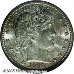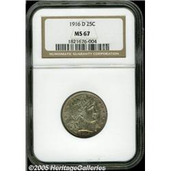 <B>1916-D 25C MS67 NGC.</B></I> The 1916-D has a substantial mintage of 6.54 million pieces and is the most saved issue in the series along with the 1892-P. While rolls were set aside at the time of issue, it is surprising that an issue with as many certified Mint State coins as the 1916-D has, is so seldom seen in Superb condition. NGC has only graded six other pieces in MS67, while PCGS has certified even fewer, only five pieces, with none finer at either service (2/05). This is a highly lustrous coin that has deep, multicolored, speckled toning over each side. Well, but not fully defined with exceptionally clean surfaces.