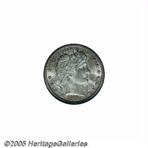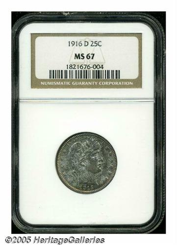 <B>1916-D<25C> MS67 NGC.</B></I> The 1916-D has a substantial mintage of 6.54 million pieces and is the most saved issue in the series along with the 1892-P. While rolls were set aside at the time of issue, it is surprising that an issue with as many certified Mint State coins as the 1916-D has, is so seldom seen in Superb condition. NGC has only graded seven other pieces in MS67, while PCGS has certified even fewer, only five pieces, with none finer at either service (6/05). This is a highly lustrous coin that has medium, multicolored, speckled toning over each side. Well, but not fully defined with exceptionally clean surfaces.