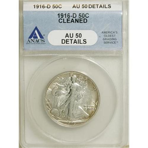 <B>1916-D 50C --Cleaned--ANACS. AU50 Details.</B></I> NGC Census: (7/1055). PCGS Population (23/1395). Mintage: 1,014,400. Numismedia Wsl. Price for NGC/PCGS coin in AU50: $205. (#6567)<BR><BR><B>Coin Engraver:</B> Adolph A. Weinman<BR><BR><b>Shipping:</b> Coins & Currency (<a target="_blank" href="http://www.heritageauctions.com/common/shipping.php">view shipping information</a>)
