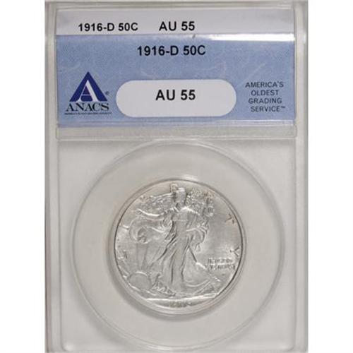 <B>1916-D 50C AU55 ANACS.</B></I> NGC Census: (21/1025). PCGS Population (81/1285). Mintage: 1,014,400. Numismedia Wsl. Price for NGC/PCGS coin in AU55: $230. (#6567)<BR><BR><B>Coin Engraver:</B> Adolph A. Weinman<BR><BR><b>Shipping:</b> Coins & Currency (<a target="_blank" href="http://www.heritageauctions.com/common/shipping.php">view shipping information</a>)