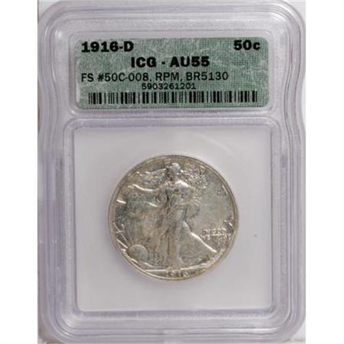<B>1916-D 50C AU55 ICG.</B></I> FS#50C-008, RPM, BR5130. NGC Census: (20/1003). PCGS Population (76/1218). Mintage: 1,014,400. Numismedia Wsl. Price for NGC/PCGS coin in AU55: $208. (#6567)<BR><BR><B>Coin Engraver:</B> Adolph A. Weinman<BR><BR><b>Shipping:</b> Coins & Currency (<a target="_blank" href="http://www.heritageauctions.com/common/shipping.php">view shipping information</a>\)