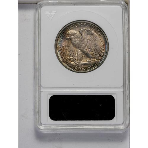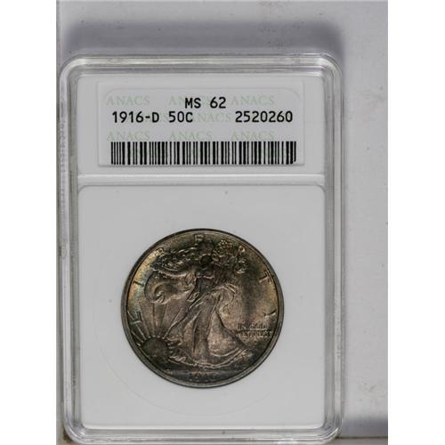 <B>1916-D<50C> MS62 ANACS.</B></I> Lustrous with moderate to heavy gold and violet toning. Striking weakness on the hand and flag is common on this issue. The surfaces show few marks for the grade.