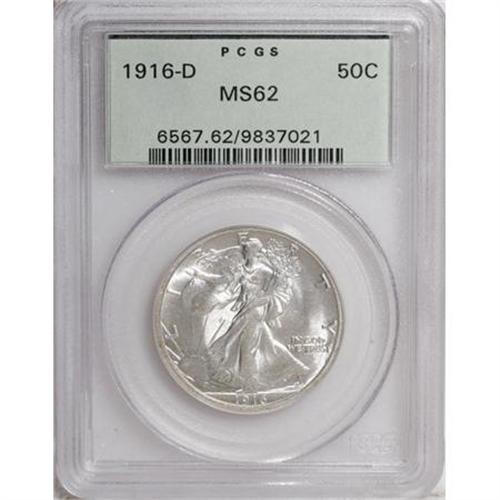<B>1916-D 50C MS62 PCGS.</B></I> The shining surfaces of this first-year branch mint half offer pleasing luster and predominantly silver-gray color, though the obverse fields have a hint of gold. Well struck with only a handful of wispy, yet grade-defining abrasions.<BR><BR><b>Shipping:</b> Coins & Currency (<a target="_blank" href="http://www.heritageauctions.com/common/shipping.php">view shipping information</a>)