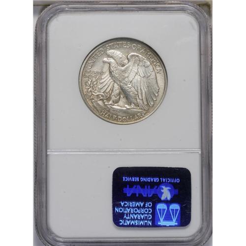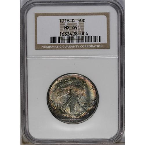 <B>1916-D<50C> MS64 NGC.</B></I> The light dove-gray patina on the reverse bears little resemblance to the beautiful blue and gold toning on the obverse of this lustrous coin. Striking weakness on the hand, typical for the series, and scattered abrasions define the grade.