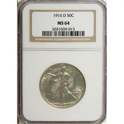 <B>1916-D 50C MS64 NGC.</B></I> This shining near-Gem displays a touch of satiny luster. Delicate golden toning graces much of the minimally marked surfaces. In the first year of the design, Denver struck just over a million pieces.<BR><BR><B>Coin Engraver:</B> Adolph A. Weinman<BR><BR><b>Shipping:</b> Coins & Currency (<a target="_blank" href="http://www.heritageauctions.com/common/shipping.php">view shipping information</a>)