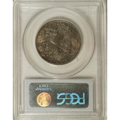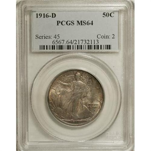 <B>1916-D 50C MS64 PCGS.</B></I> The highest-mintage of three issues for this first year of the Walking Liberty design, though production barely surpassed a million pieces. This surprisingly well-defined Choice example has pleasing definition on the branch hand and eagle. Soft luster shines beneath a spread of gold, lavender, aqua, and sunset-orange colors.<BR><BR><b>Shipping:</b> Coins & Currency (<a target="_blank" href="http://www.heritageauctions.com/common/shipping.php">view shipping information</a>)