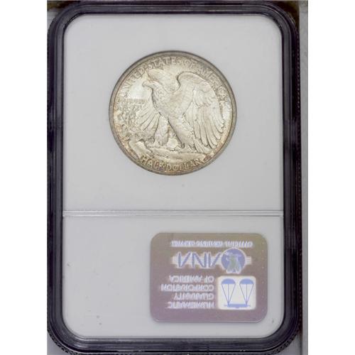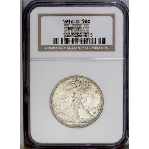 <B>1916-D<50C> MS65 NGC.</B></I> The 1916-D is somewhat scarcer in the better grades of Mint State than its 1 million-plus mintage might suggest. Fewer than 300 Gem examples have been certified by NGC and PCGS combined, and less than 90 coins grading finer (3/06). This specimen displays bright lustrous surfaces visited by occasional whispers of cobalt-blue, golden-brown, and lavender patination. The design elements are sharply impressed, with virtually full definition on Liberty's left thumb. A small mark on the upper left leg may prevent an even higher grade. <BR><BR><B>Important notice:</B> Heritage usually auctions material at the rate of 200-250 lots per hour. On some occasions eBay Live bid software or the Internet may not be able to keep up with the pace of the auction. We recommend placing a realistic absentee bid now as insurance to avoid disappointment. Occasionally the auctioneer may eliminate or reject an eBay Live bid, and the auctioneer may also reopen a lot after the close of the eBay live bidding (usually because we missed an audience bid), and may reject your bid even if it shows you as the winning bidder. By bidding via eBay Live, you agree that Heritage may award the lot to another bidder at its sole discretion under the circumstances described above or any other reasonable circumstances. Since eBay bids are not shown to us until we open the lot on the floor, we treat those bids just like floor bids. In most cases the floor responds before the eBay bid is presented to us, due to Internet lag time, so for consistency we have made it a policy that floor bids are always considered first over tie eBay live bids. Also please note that all Heritage lots purchased through eBay Live carry a 20% Buyer's Premium. Please make sure you read the Terms and Conditions before you bid. This lot is being auctioned in conjunction with a live floor auction by Heritage Galleries & Auctioneers. All final auction and invoice information will be supplied by Heritage Galleries & Auctioneers, and all other information should be considered preliminary. Lot:2906 <BR><BR><B>Winning Notification and Billing:</B> After the FINAL session in this auction is complete, Heritage will send e-mail and snail mail invoices. This process normally takes several days. All final auction and invoice information will be supplied by Heritage Galleries & Auctioneers, and all other information should be considered preliminary. <BR><BR>This auction will be conducted on a live auction floor and over the Internet through eBay Live. If you choose to place an absentee bid, please take a moment to <font color='#0000ff'><u><a href='http://pages.ebay.com/liveauctions/help/before/laabsentee.html'>learn how eBay Live absentee bidding works</a></u></font><font color='#000000'>