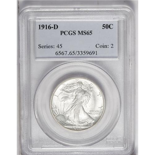 1916-D 50C MS65 PCGS. A lovely, pale silver coin, with