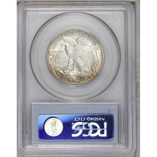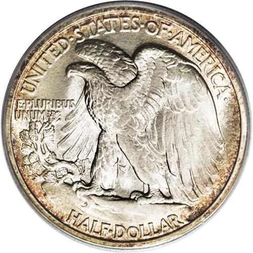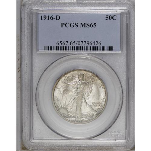 <B>1916-D<50C> MS65 PCGS.</B></I> Softly detailed over the central devices, this lustrous Gem exhibits distinctly matte-like surface textures and attractive, speckled peripheral patina on both sides. Silver-gray is the primary color. Well preserved and free of distracting marks, with a couple of small blemishes noted on the obverse. Popular first-year issue.