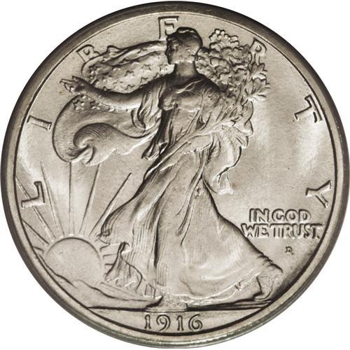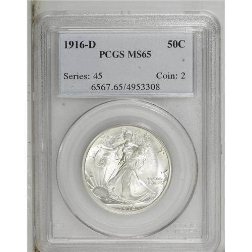 <B>1916-D 50C MS65 PCGS.</B></I> The first year of the type was also a low mintage year. The 1916-D has the highest mintage of the three issues, yet only 1,014,400 pieces were struck. This crisply struck Gem is virtually brilliant, and is impressively free from visible marks. One of only four issues in the series with obverse mintmarks.<BR><BR><b>Shipping:</b> Coin/Currency (<a target="_blank" href="http://www.heritageauctions.com/common/shipping.php">view shipping information</a>)