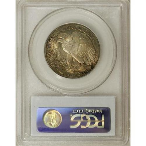 <B>1916-D 50C MS65 PCGS.</B></I> The obverse of this first year Gem is layered in vivid target toning that begins with mint-green in the centers and deepens to burnt-orange, rose, and emerald-green as its advances peripherally. Less dramatic violet and olive-brown toning affects the outer portions of the reverse.<BR><BR><B>Coin Engraver:</B> Adolph A. Weinman<BR><BR><b>Shipping:</b> Coins & Currency (<a target="_blank" href="http://www.heritageauctions.com/common/shipping.php">view shipping information</a>\)
