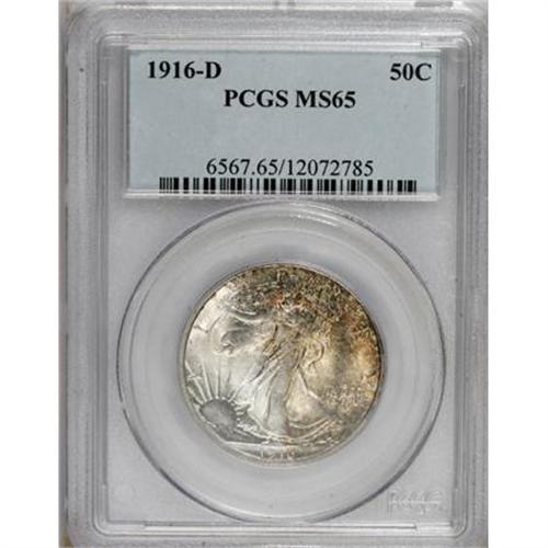 <B>1916-D 50C MS65 PCGS.</B></I> This attractive first-year Gem exhibits vibrant mint luster through original tan and russet toning that blankets the reverse and covers about half of the obverse. Well struck and pleasingly preserved, an attractive example of the short-lived Obverse Mintmark subtype.<BR><BR><B>Coin Engraver:</B> Adolph A. Weinman<BR><BR><b>Shipping:</b> Coins & Currency (<a target="_blank" href="http://www.heritageauctions.com/common/shipping.php">view shipping information</a>)