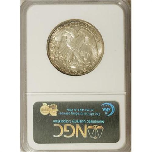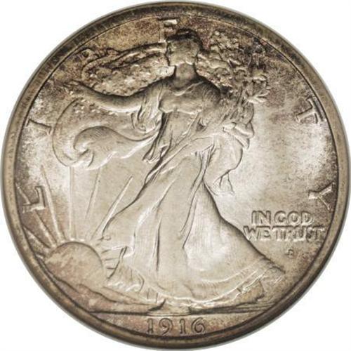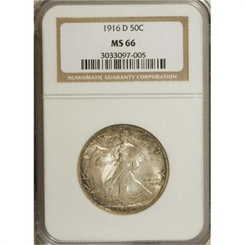 <B>1916-D 50C MS66 NGC.</B></I> The novelty and extreme beauty of the Walking Liberty design meant that a fair number of these first year issues were saved for posterity by both novice and serious collectors alike. Precious few, however, survived in the exemplary condition of this example. In addition to its radiant, satiny sheen and absence of surface marks, both sides are deliciously framed in mottled golden-violet toning. Census: 36 in 66, 7 finer (6/07). <BR><BR><B>Coin Engraver:</B> Adolph A. Weinman<BR><BR><b>Shipping:</b> Coins & Currency (<a target="_blank" href="http://www.heritageauctions.com/common/shipping.php">view shipping information</a>\)