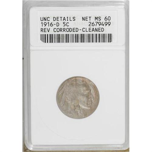 <B>1916-D 5C --Cleaned, Rev Corroded--ANACS. Unc Details Net MS60.</B></I> NGC Census: (6/696). PCGS Population (15/978). Mintage: 13,333,000. Numismedia Wsl. Price for NGC/PCGS coin in MS60: $117. (#3932)<BR><BR><B>Coin Engraver:</B> James E. Fraser<BR><BR><b>Shipping:</b> Coins & Currency (<a target="_blank" href="http://www.heritageauctions.com/common/shipping.php">view shipping information</a>)