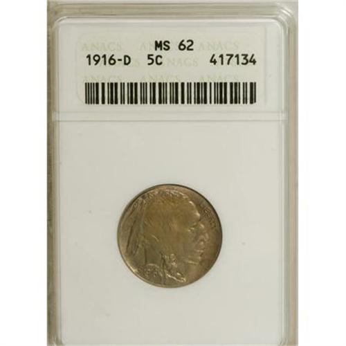 <B>1916-D 5C MS62 ANACS.</B></I> NGC Census: (151/498). PCGS Population (145/798). Mintage: 13,333,000. Numismedia Wsl. Price for NGC/PCGS coin in MS62: $158. (#3932)<BR><BR><B>Coin Engraver:</B> James E. Fraser<BR><BR><b>Shipping:</b> Coins & Currency (<a target="_blank" href="http://www.heritageauctions.com/common/shipping.php">view shipping information</a>)