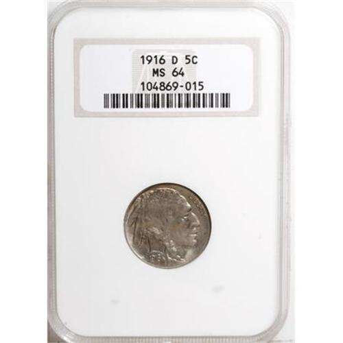 <B>1916-D 5C MS64 NGC.</B></I> NGC Census: (254/46). PCGS Population (362/122). Mintage: 13,333,000. Numismedia Wsl. Price for NGC/PCGS coin in MS64: $420. (#3932)<BR><BR><B>Coin Engraver:</B> James E. Fraser<BR><BR><b>Shipping:</b> Coins & Currency (<a target="_blank" href="http://www.heritageauctions.com/common/shipping.php">view shipping information</a>)