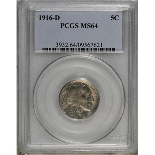 <B>1916-D 5C MS64 PCGS.</B></I> . PCGS Population (369/130). NGC Census: (256/46). Mintage: 13,333,000. Numismedia Wsl. Price for NGC/PCGS coin in MS64: $420. (#3932)<BR><BR><B>Coin Engraver:</B> James E. Fraser<BR><BR><b>Shipping:</b> Coins & Currency (<a target="_blank" href="http://www.heritageauctions.com/common/shipping.php">view shipping information</a>)