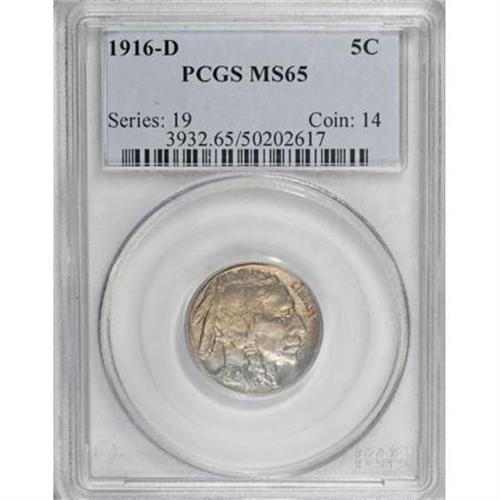 <B>1916-D 5C MS65 PCGS.</B></I> A satiny Gem with gold toning over about 75% of each side, the bottom obverse and top reverse exhibiting light gray color. PCGS has only certified 10 finer examples of this date (1/08).<BR><BR><B>Coin Engraver:</B> James E. Fraser<BR><BR><b>Shipping:</b> Coins & Currency (<a target="_blank" href="http://www.heritageauctions.com/common/shipping.php">view shipping information</a>)
