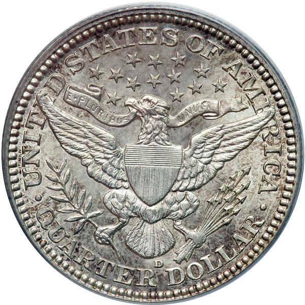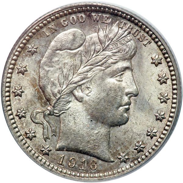 1916-D. PCGS graded MS-63. Nice and frosty and lightly toned. The 1916-D Barber was saved in roll quantity at the time of issue (possibly once it was known the Type was being discontinued). Coins of this issue, and choice as offered here, always have pleasing scintillating frostiness (PCGS # 5674) .