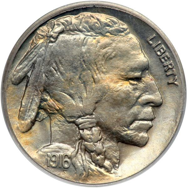 1916-D Buffalo Nickel. PCGS graded MS-65. Housed in an Old Green Holder. Lovely golden toning. A beaming gem rolling in unbeatable cartwheel luster that emits boldly beneath multihued highlights. Possessed of a much better-quality strike than is normally found for a '16-D Buffalo nickel. Pop 109; 12 finer, 1 in 65+, 11 in 66 (PCGS # 3932) .