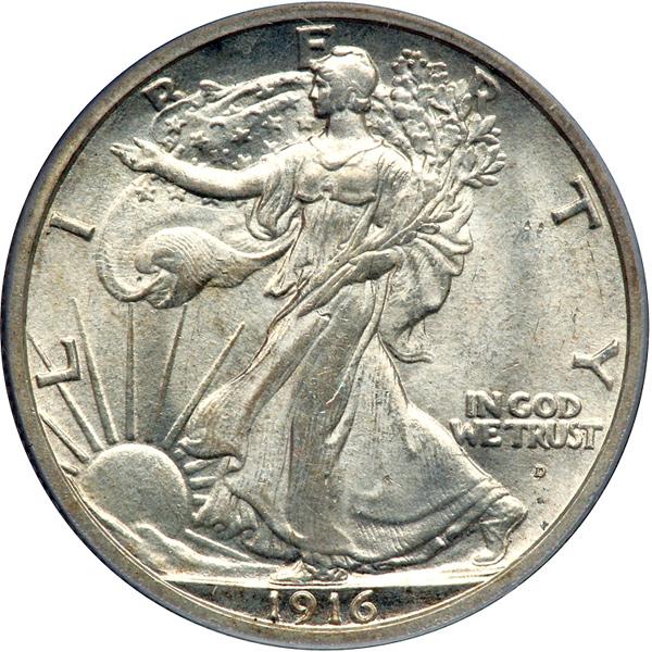 1916-D Liberty Walking Half Dollar. PCGS graded MS-64 PQ. A nice frosty example that has lovely originality and no defects of any kind. Weinman's Walking Liberty half dollar, highly regarded today, evoked varied reactions when it made its debut. "At last we have on our coins the great American eagle in a natural, lifelike form," The Numismatist said. "As represented on the half dollar he is, as the small boy would say, 'some bird,' and his size and proportions are in keeping with the greatness and power of the country." (PCGS # 6567) .