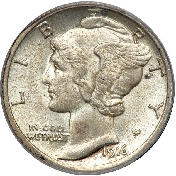 1916-D Mercury Dime. PCGS graded MS-63 Full Bands. Well struck and lightly toned. A popular key date. The federal government's production of only 264,000 Dimes at the Denver Mint in 1916 appears to have created a feeding frenzy among contemporary coin collectors when they discovered how scarce these coins truly were. Since quality control was still good for the sake of the new design, most 1916-P,D, and S Mercury dimes emerged from the presses with defined central and peripheral devices. Later issues would deteriorate as quality control lapsed. The present example and exemplar of Choice MS63 quality. Both sides are fully struck in all areas with crisp, well rounded crossbands. The surfaces are nicely frosted beneath delicate shades leaving much of the silvery iridescence intact and gleaming (PCGS # 4907) .