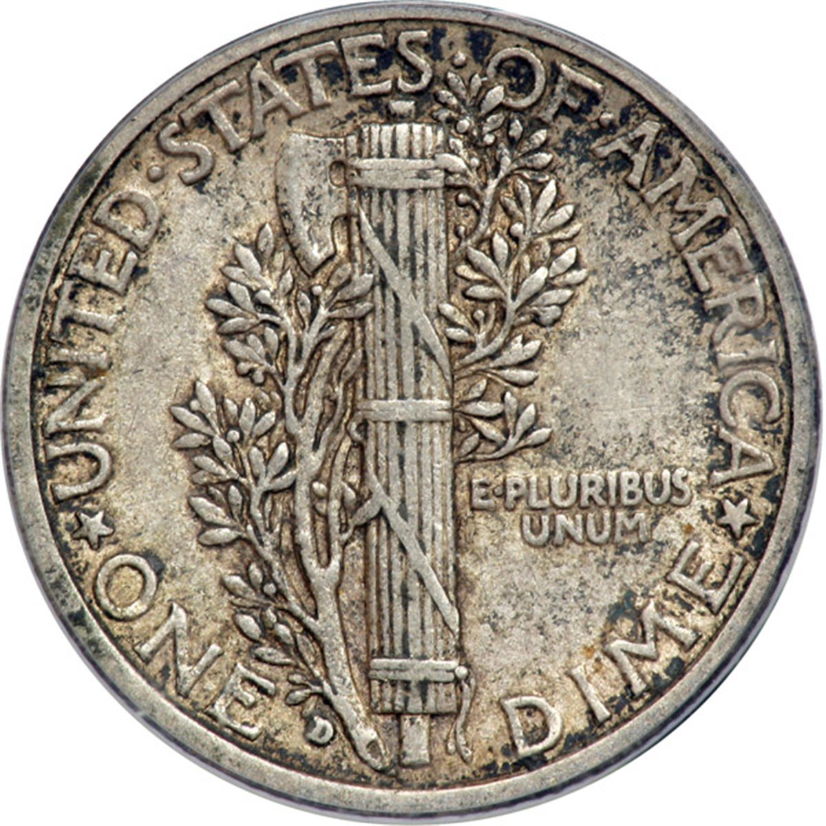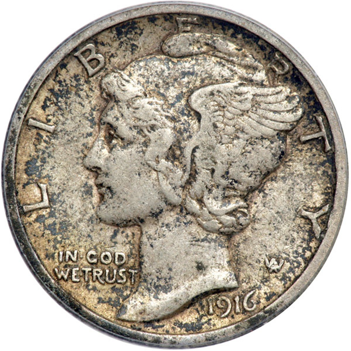 In "The Silver Coinage of 1916 - An Artistic Renaissance," Thomas S. LaMarre mentions in referring to the new designs introduced in 1916, "the Winged Liberty Head dime was first to appear, entering circulation in the latter part of October 1916. ‘The design of the dime, owing to the smallness of the coin, has been held quite simple,’ Mint Director F.J.H. von Engelken said. ‘The obverse shows a head of Liberty with winged cap. The head is firm and simple in form; the profile forceful. The reverse shows a design of the bundle of rods, with battle-ax, known as Fasces, and symbolical of unity, wherein lies the Nation's strength. Surrounding the fasces is a full-foliaged branch of olive, symbolical of peace.’" (PCGS # 4906) .